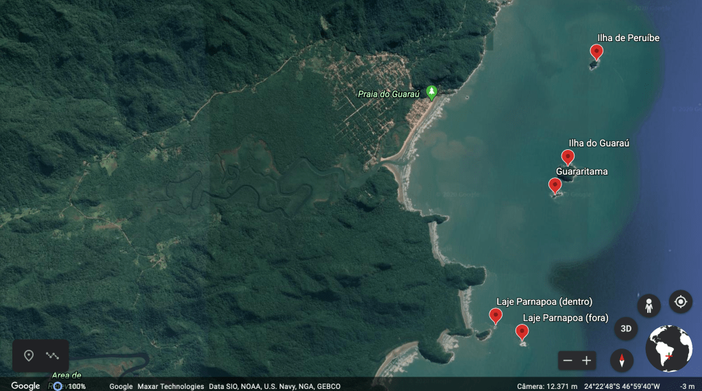 No último sábado realizamos uma saída de campo nas ilhas próximas ao Guaraú (fig.1), região de Peruíbe, litoral centro de São Paulo. Nosso objetivo foi observar as aves que estão frequentando o local e se havia alguma espécie reproduzindo por ali (com especial olhar para os trinta-réis). Visitamos a Ilha de Peruíbe, Guaraú & Guararitama e Lajes de fora e dentro de Parnapoa (fig.2).