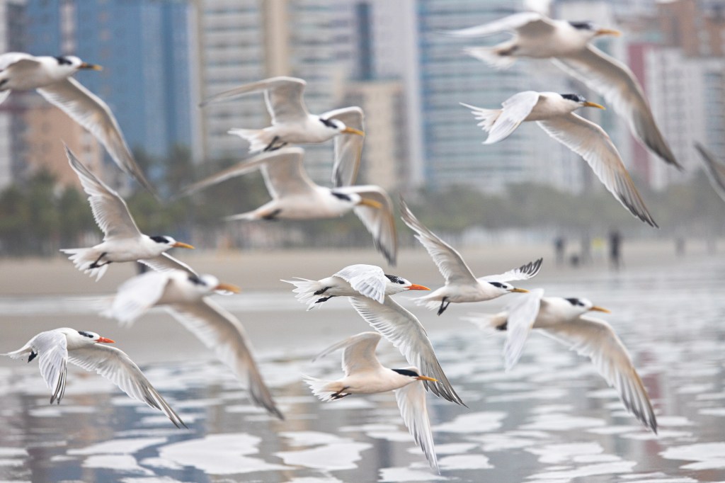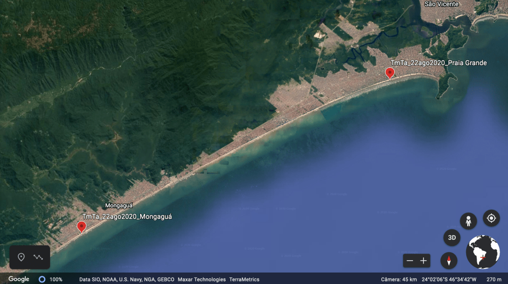 No último sábado, dia 22 de agosto, realizamos a primeira saída para monitorar os bandos de trinta-réis (Thalasseus maximus e Thalasseus acuflavidus) que frequentam as praias de Praia Grande e Mongaguá, litoral centro paulista (fig.1). O tempo estava encoberto, vento constante, maré alta e episódios frequentes de chuva. Poucas pessoas estavam na faixa de areia.