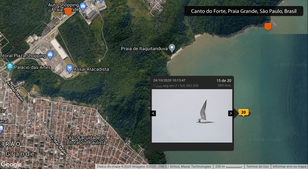 Percorremos toda a extensão marinha do Parque, de Paranapuã (São Vicente) até a área de Itaipu (Praia Grande). Encontramos uma área próxima à praia de Itaquitanduva (fig.1) onde diversos trinta-réis (Reais, Thalasseus maximus e de-bando, Thalasseus acuflavidus) estavam à procura de peixes (também pescando!) e para nossa surpresa, registramos o trinta-réis-boreal (Sterna hirundo) entre o bando (fig.2, registro Wikiaves: http://www.wikiaves.com/4039880).