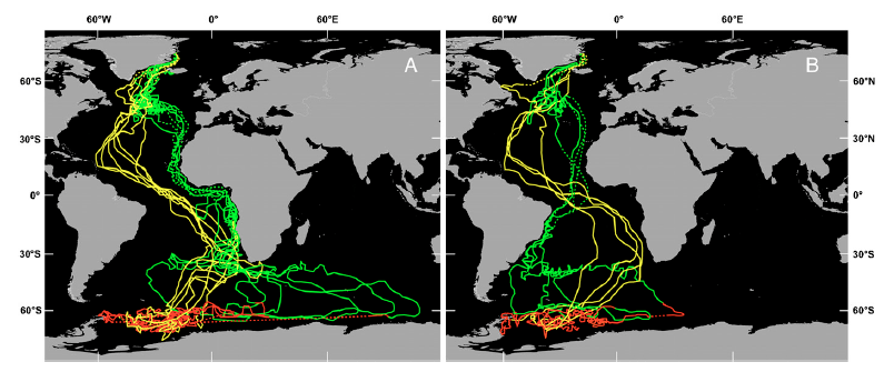 Apesar dessas diferenças iniciais na migração para o sul, todas as aves convergiram para o mesmo destino: o Oceano Antártico, onde passaram o verão austral alimentando-se em zonas altamente produtivas (krill), como o Mar de Weddell. Posteriormente, retornaram ao norte por uma rota mais direta e veloz, completando um ciclo migratório que pode superar 80.000 km por ano.