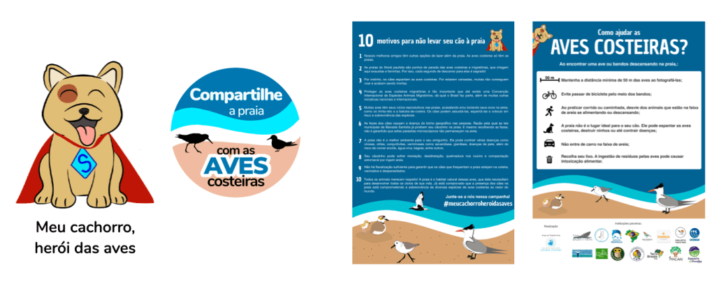 Together with several institutions, the project is part of the Working Group on Birds of the Central Coast Marine Protected Area (APAMLC), which promotes actions aimed at the protection and conservation of coastal birds within the APA. The group’s first initiative was the creation of the campaign “My Dog, a Hero for Birds”, conceived by the Wader Project (Peruíbe), which seeks to raise awareness among dog owners about the importance of not taking their pets to the beach.